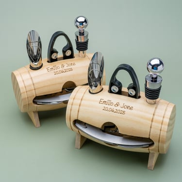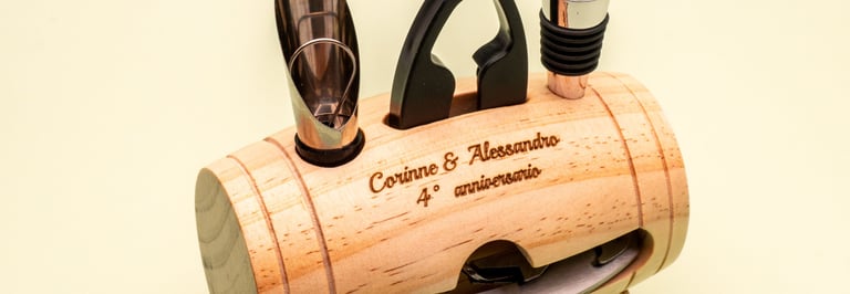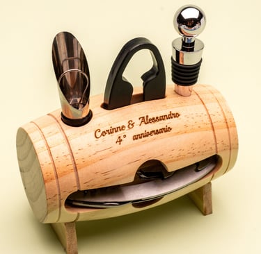 La botte è realizzata in legno e personalizzabile con incisione laser: puoi incidere un nome, una data o una dedica speciale, trasformando il set in un regalo unico, che parla direttamente al cuore di chi lo riceve.